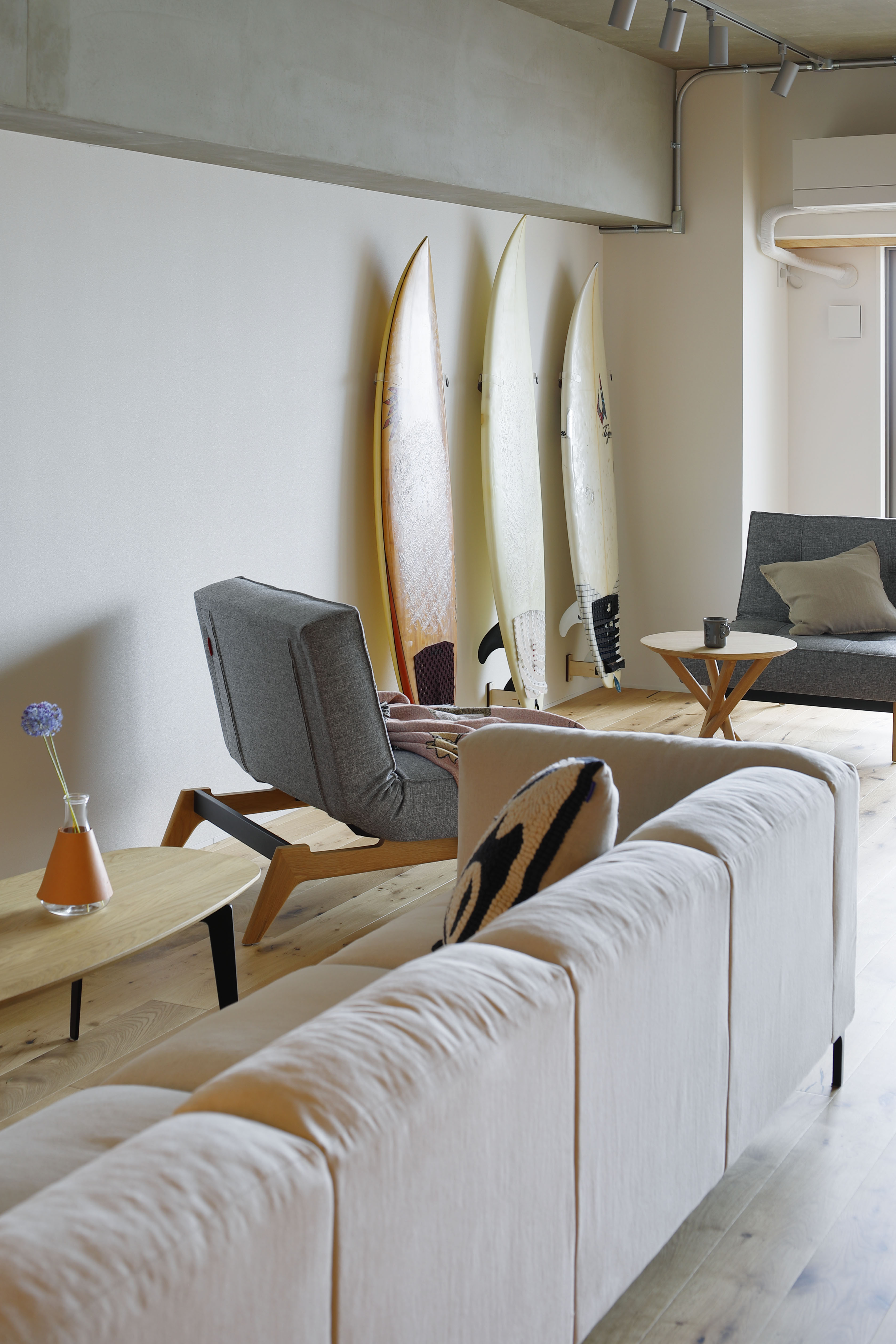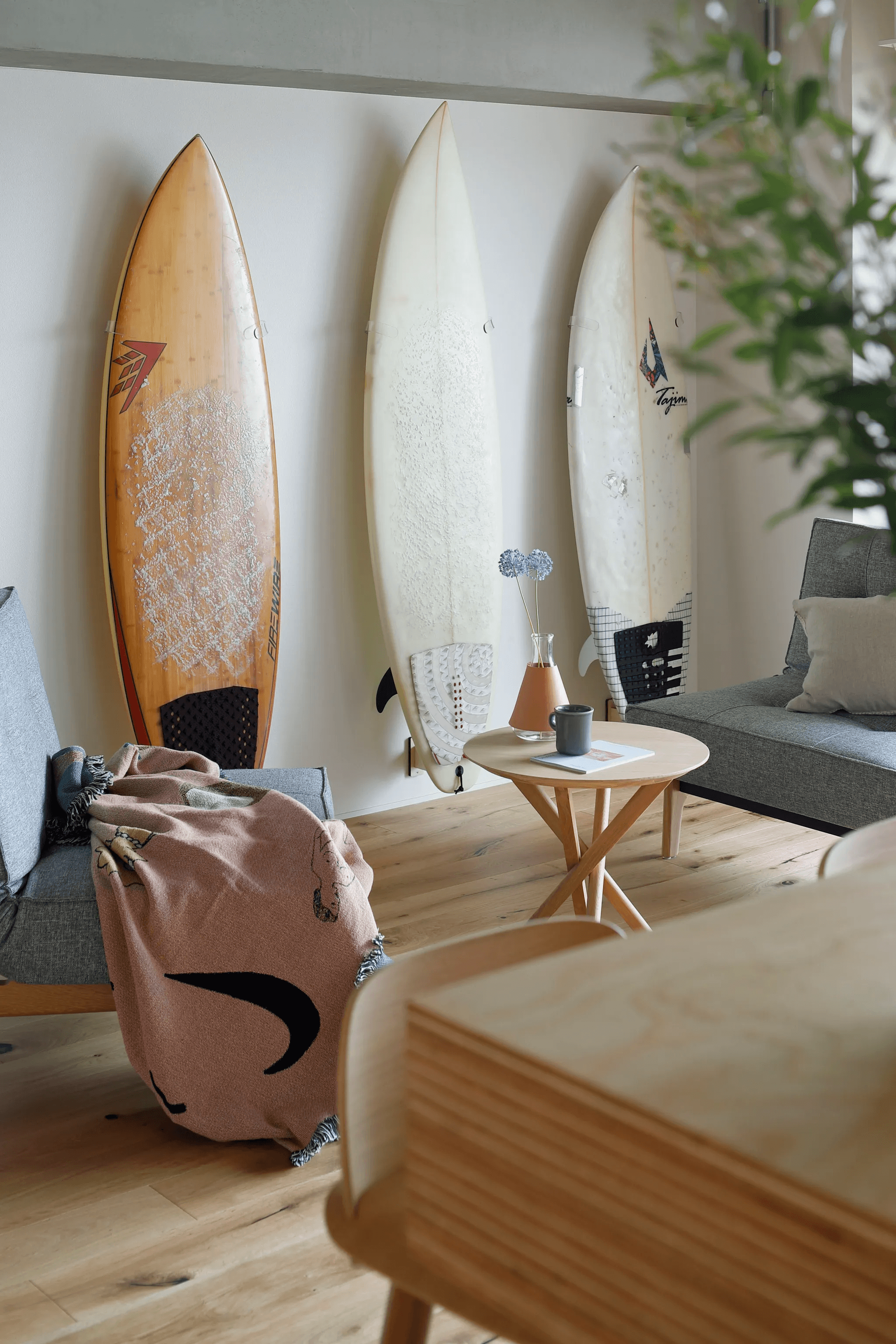 リビングにはサーフボードの収納スペースを設け、インテリアの一部として取り入れ、木材を使用したフローリングで温かみのある空間を表現しています。