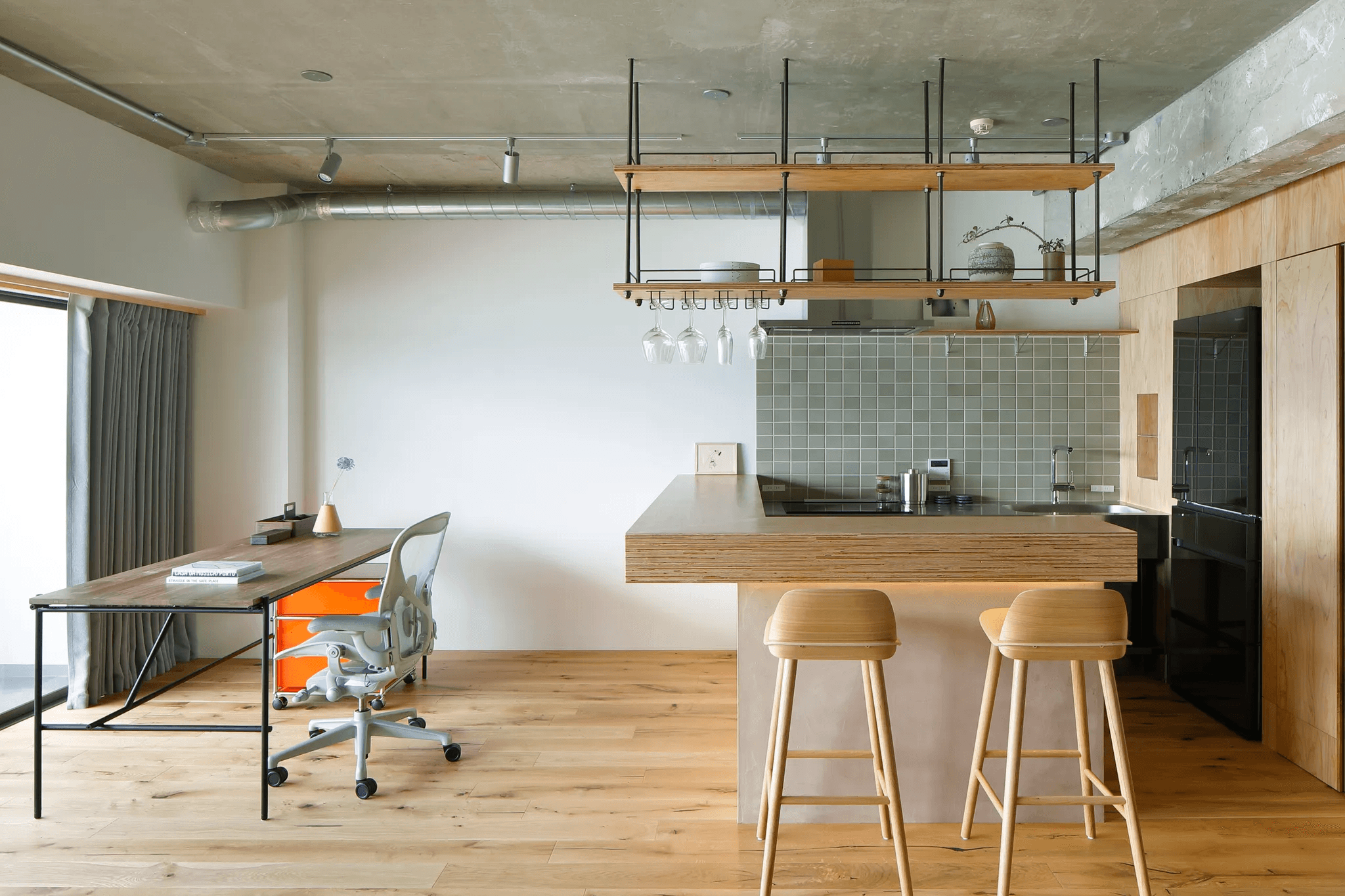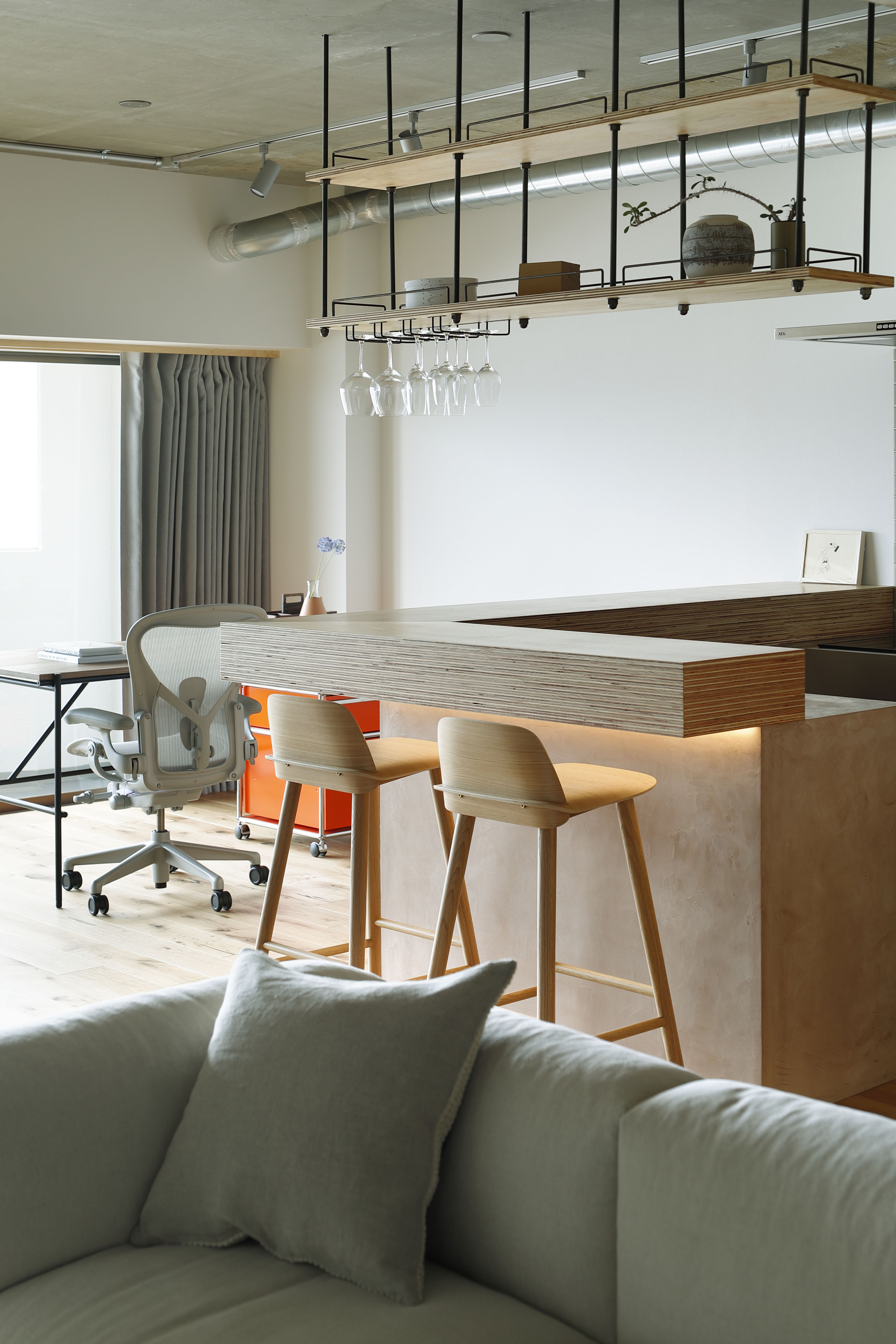 また、サーフィンの合間の仕事スペースと、くつろぎのためのカウンターを設置し、遊びと仕事が自然に融合するセカンドハウスが実現しました。
