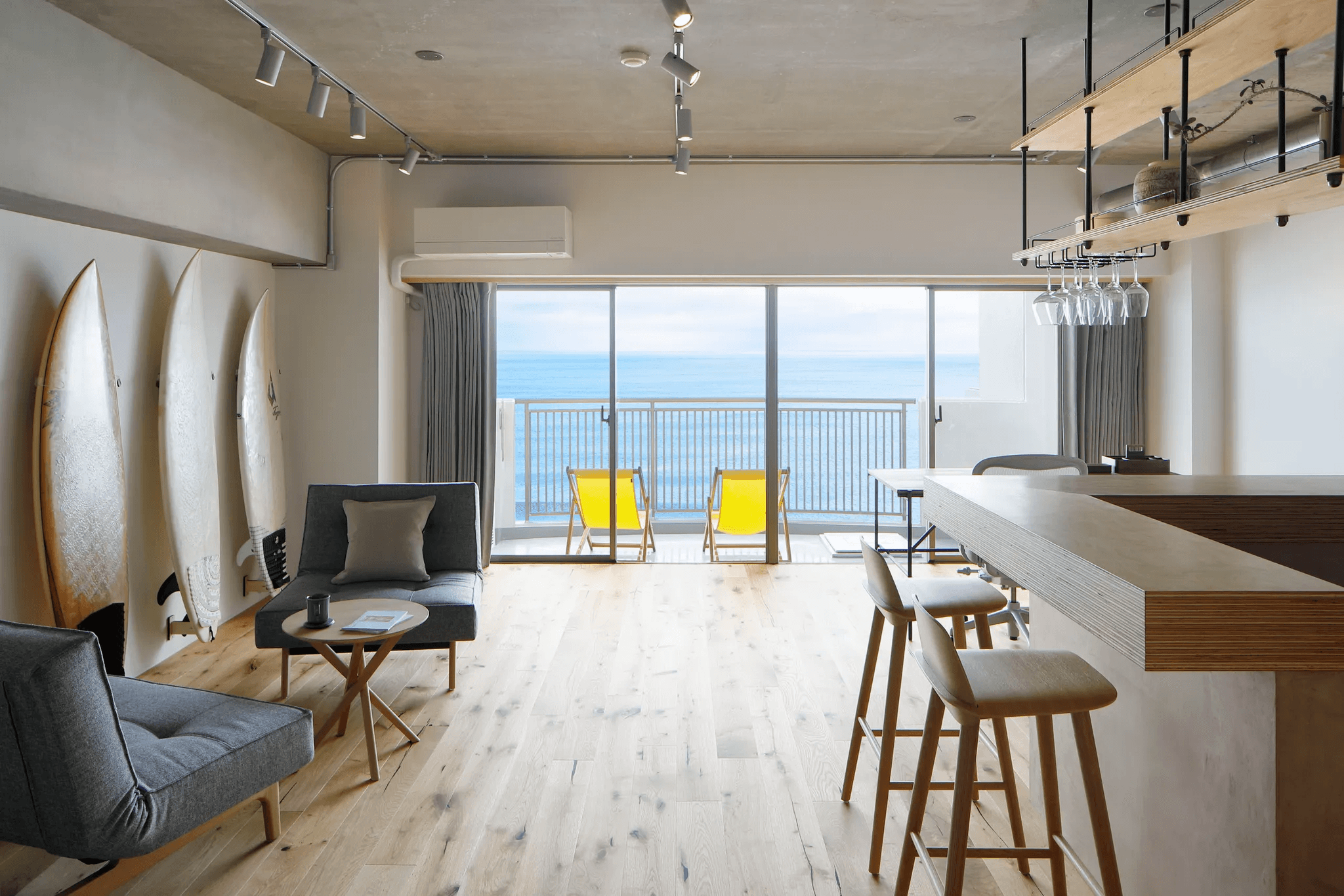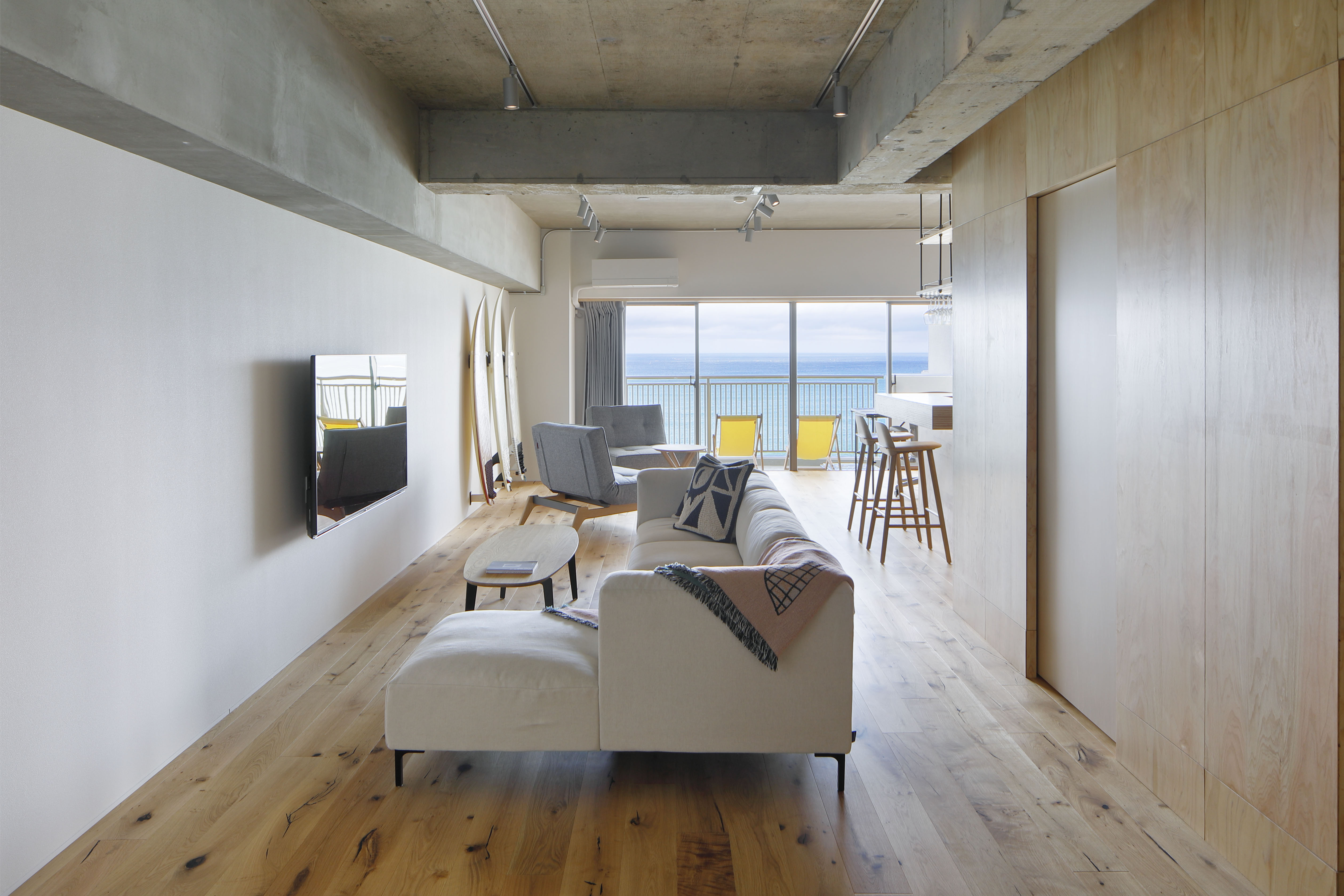 海を望む贅沢な眺望を活かした、サーフィンを楽しむためのセカンドハウスリノベーション。2LDKから1LDKへの間取り変更により、開放的な空間を実現。西海岸テイストを取り入れた内装デザインと、サーフボードの収納を兼ねたインテリアが特徴的な、遊びと仕事が融合する居住空間です。