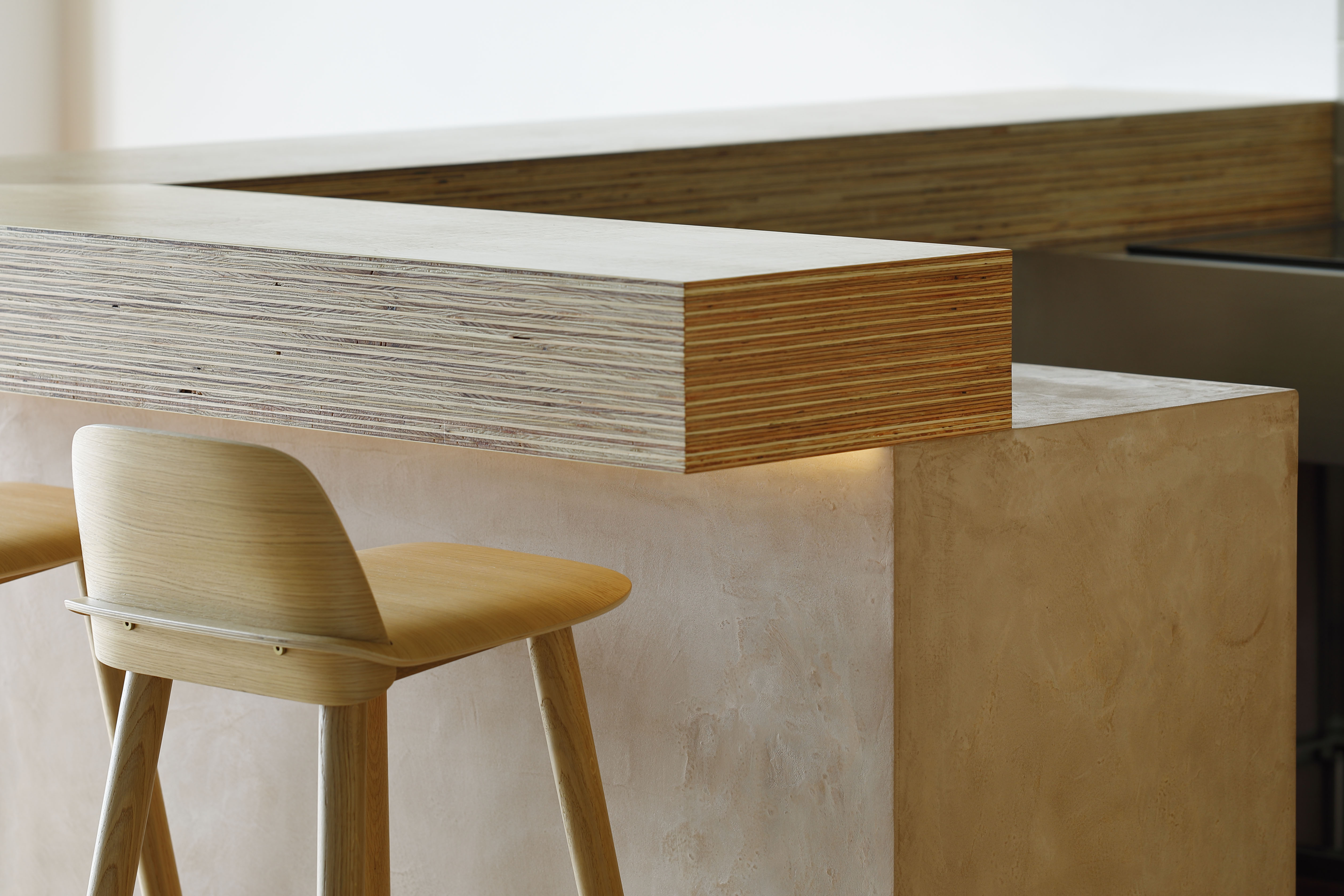 天板のトップには厚みを持たせた積層合板を利用。モールテックスと組み合わせることで、カジュアルだけど軽くなりすぎず、周りとのバランスを保っている。