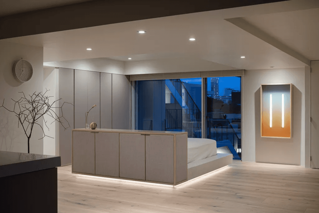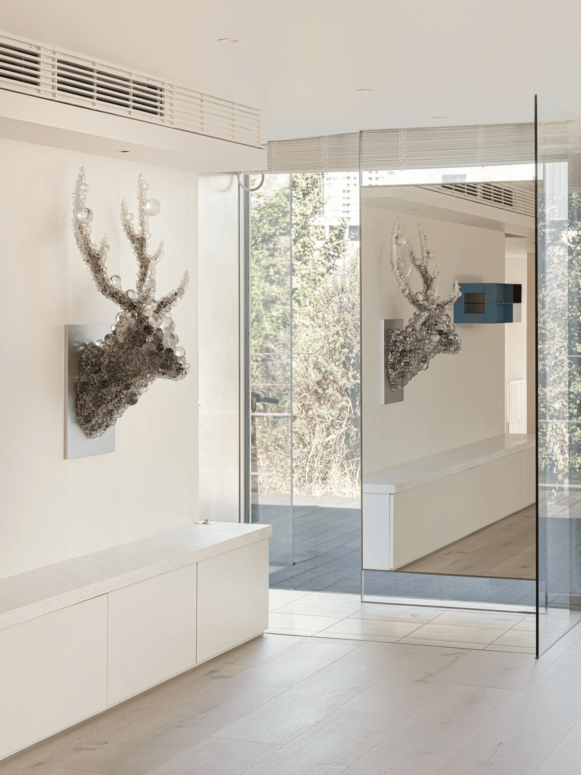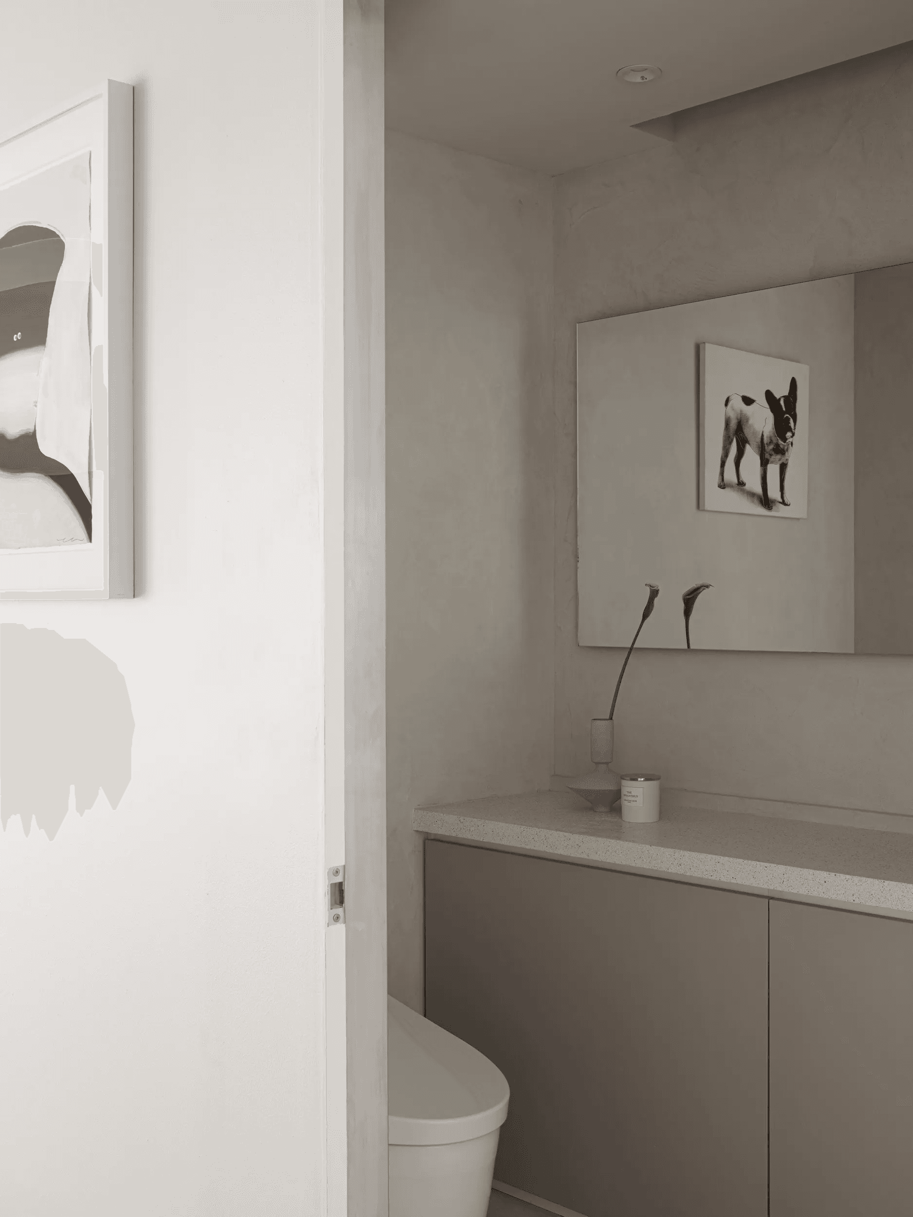 都心にありながら森に隣接する集合住宅の一室を、開放感あふれるワンルームへリノベーション。空間全体を上品なトーンでまとめ、アートが自然に溶け込む住まいを実現しました。