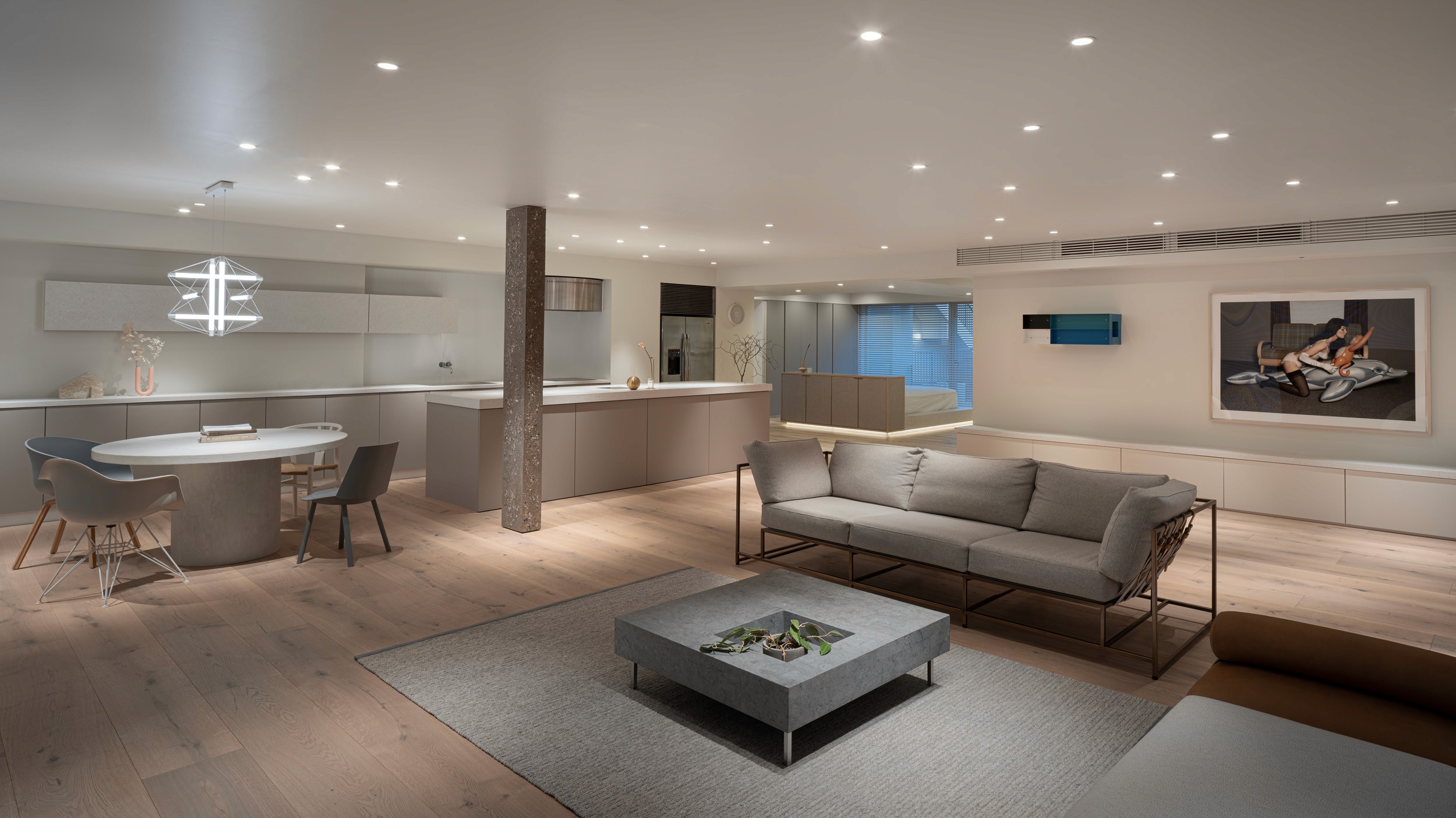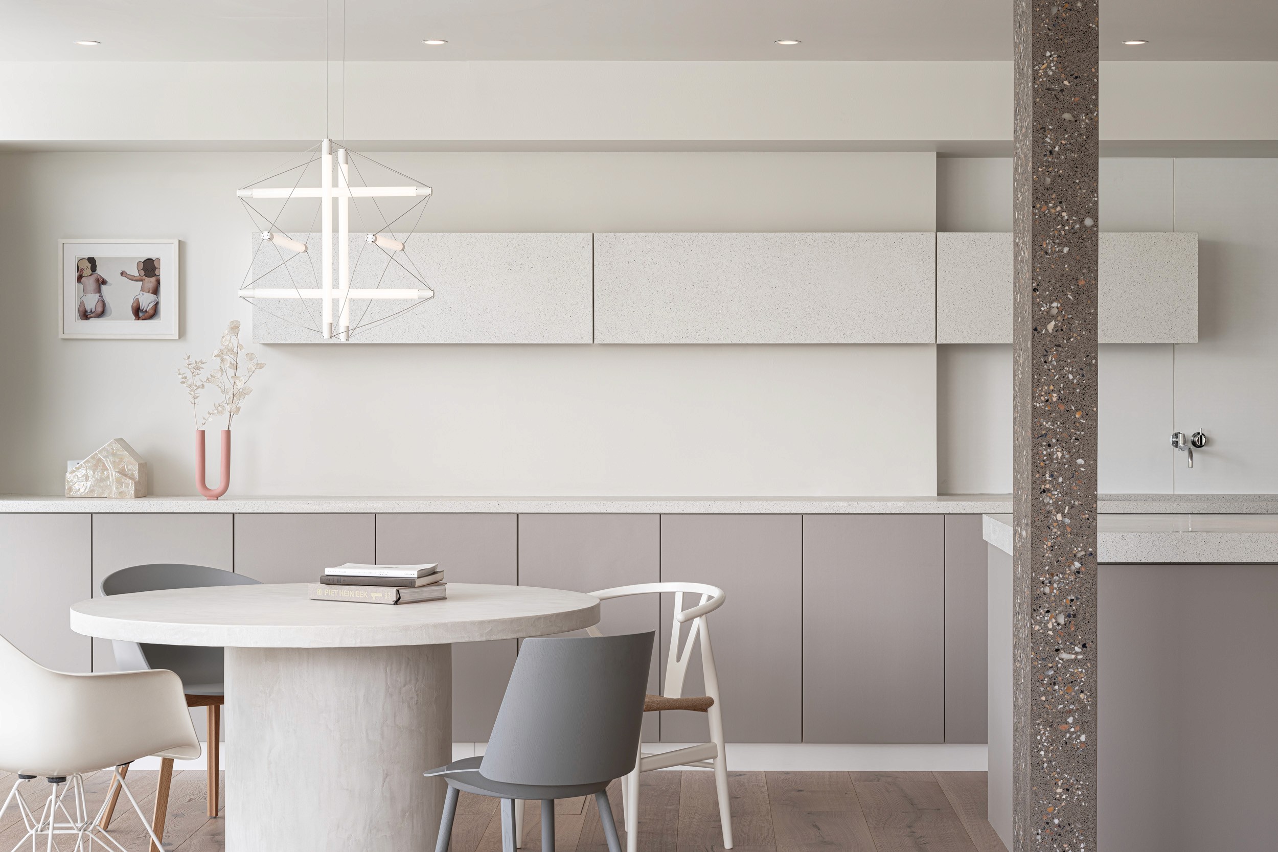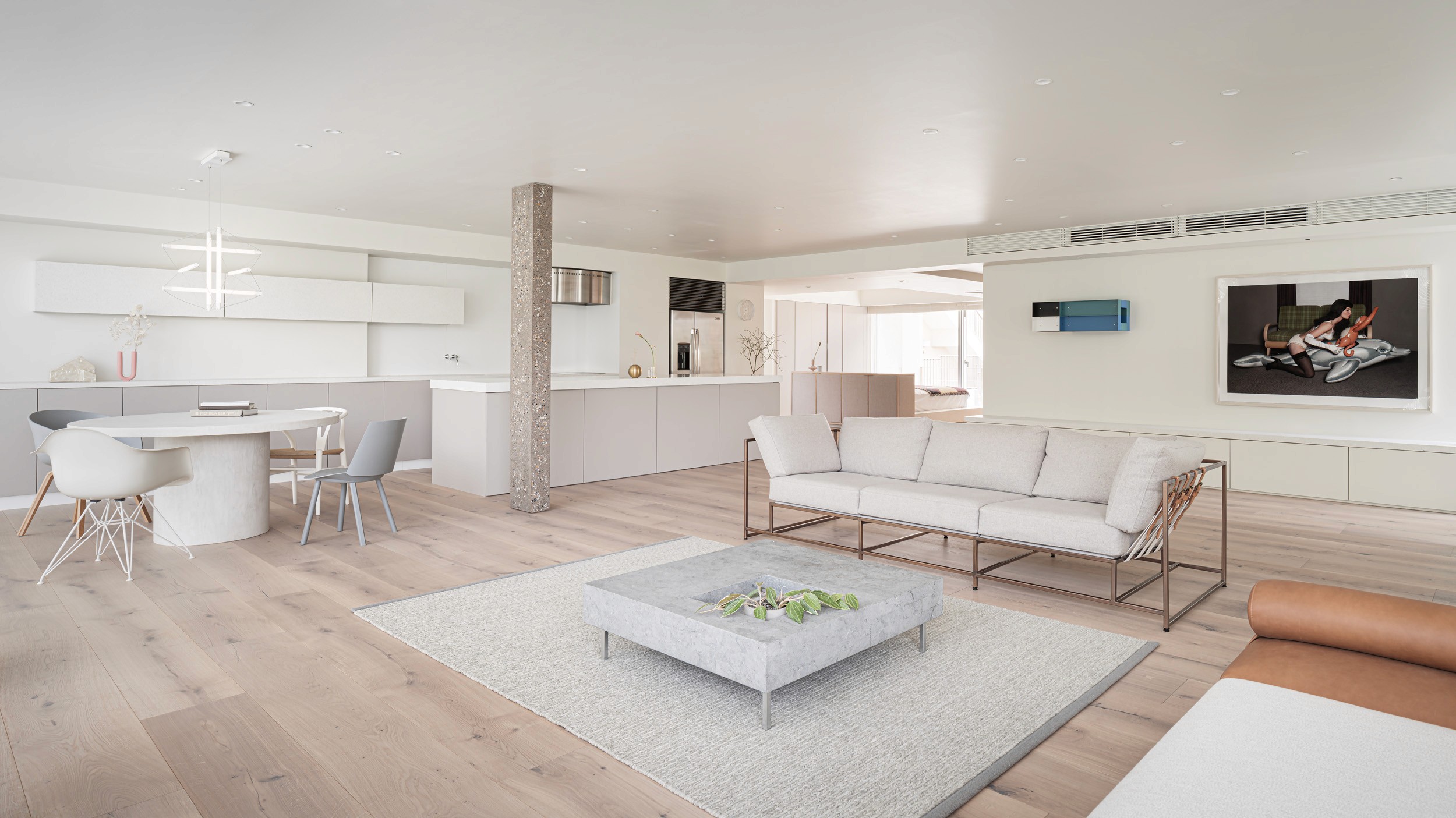 白を基調とした空間に、建具に淡いピンクグレーを取り入れ、モノトーンになりすぎない柔らかな印象を演出。 フローリングには最大幅の広葉樹材を使用し、ギャラリーのようなシンプルで品格のある空間を目指しました。 また、ビールストーンを用いた柱がアクセントとなり、視覚的なリズムを生み出しています。 透明感のあるミニマルなデザインの中に、アートと暮らしが調和する心地よい住まいを実現しました。