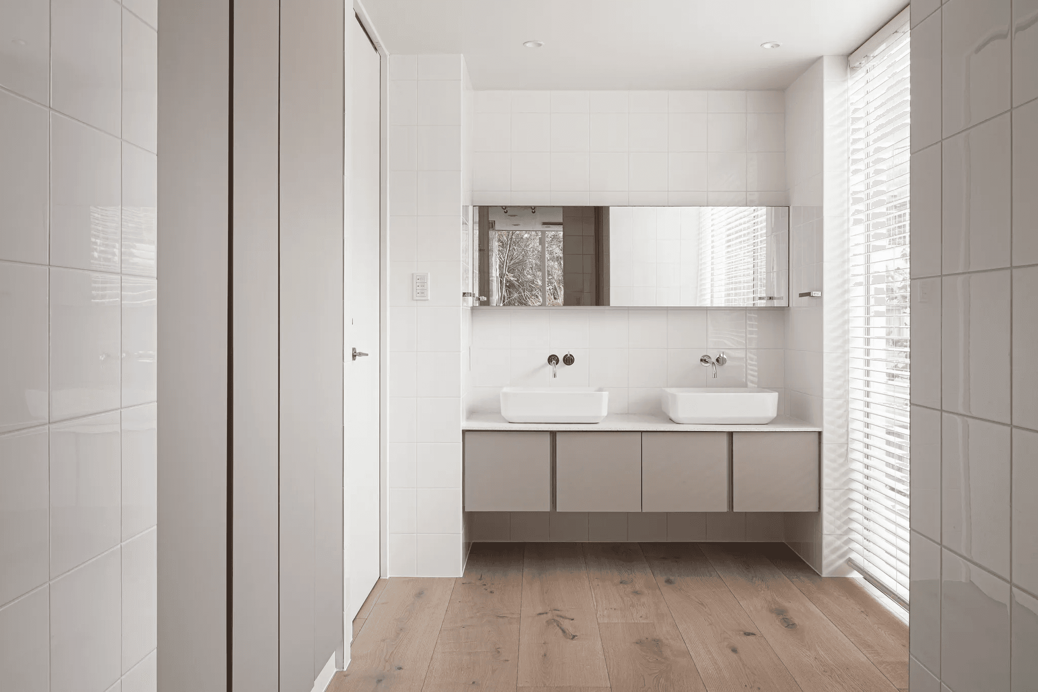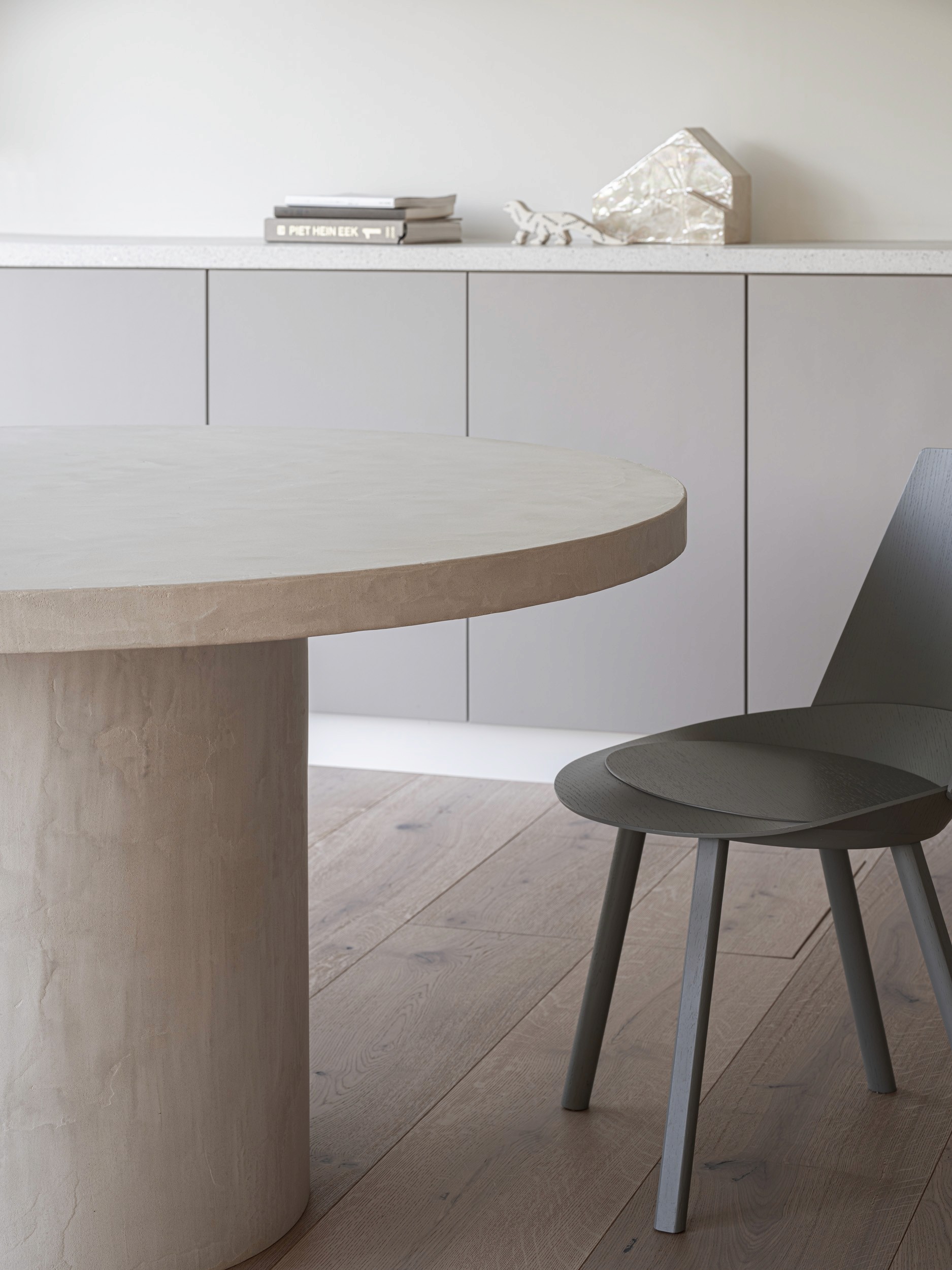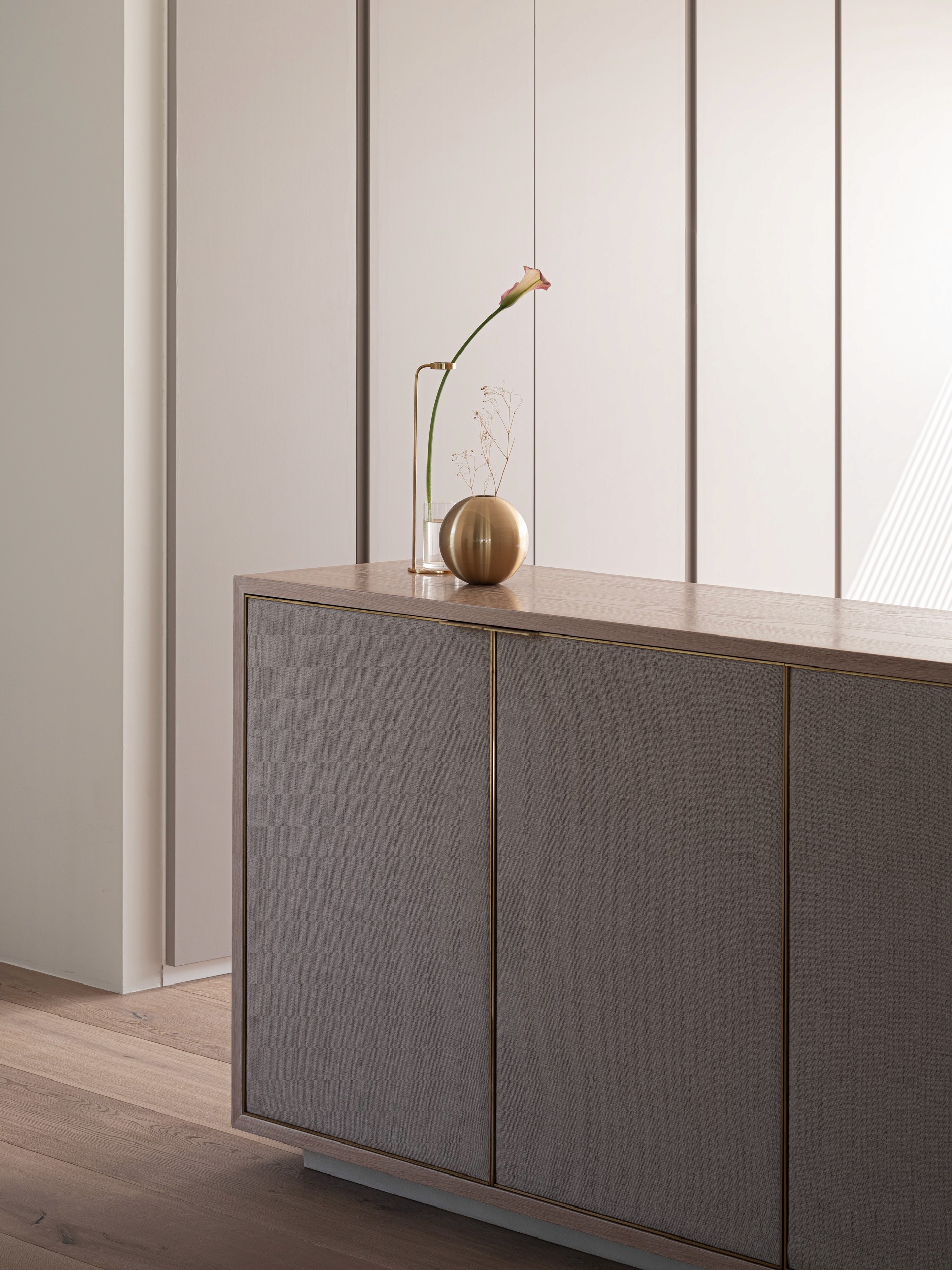 白を基調とした空間に、建具に淡いピンクグレーを取り入れ、モノトーンになりすぎない柔らかな印象を演出。 フローリングには最大幅の広葉樹材を使用し、ギャラリーのようなシンプルで品格のある空間を目指しました。 また、ビールストーンを用いた柱がアクセントとなり、視覚的なリズムを生み出しています。 透明感のあるミニマルなデザインの中に、アートと暮らしが調和する心地よい住まいを実現しました。