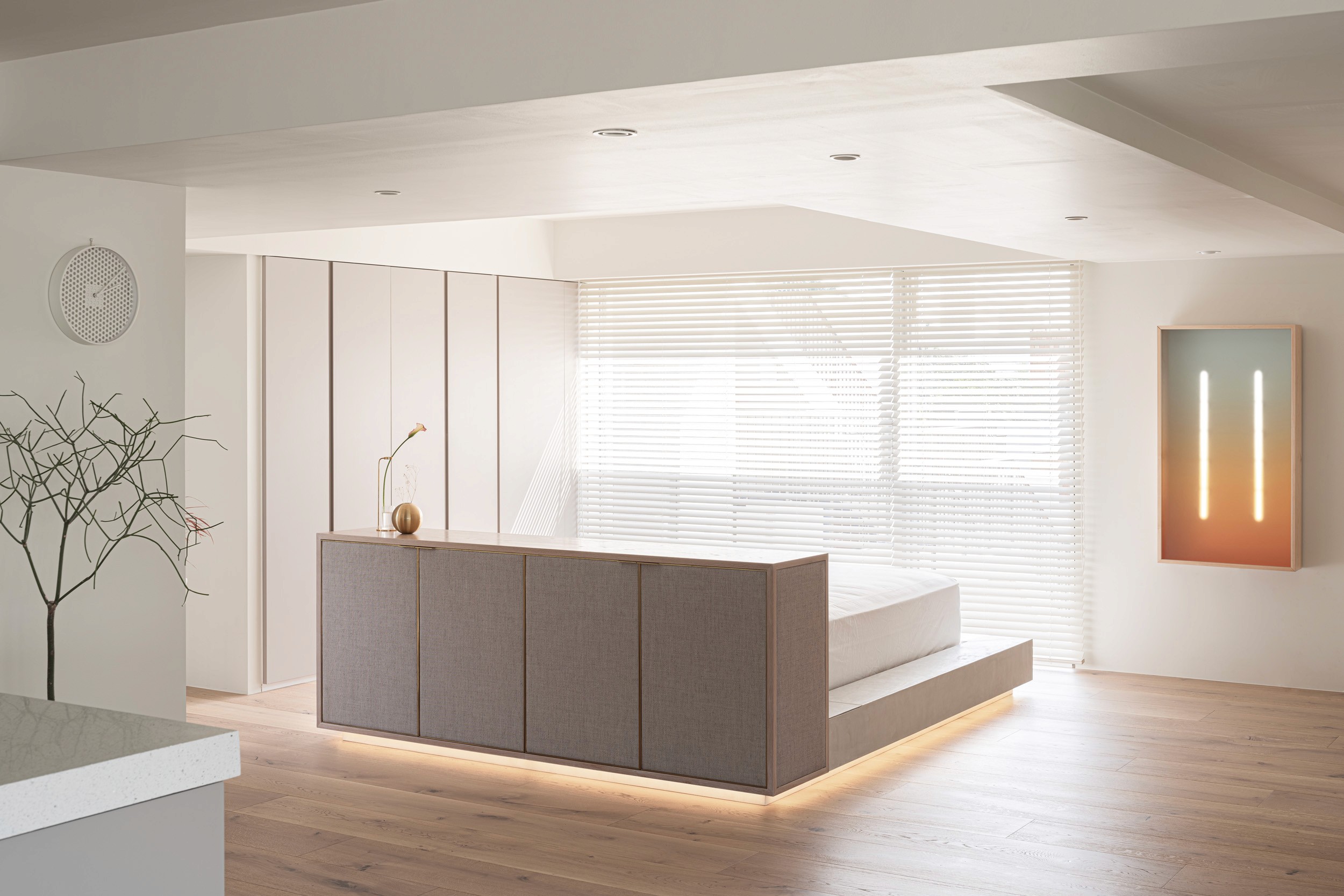 寝室までひとつながりの空間としながらも、ほどよく視線を遮るために、収納を兼ねたヘッドボードを設えました。