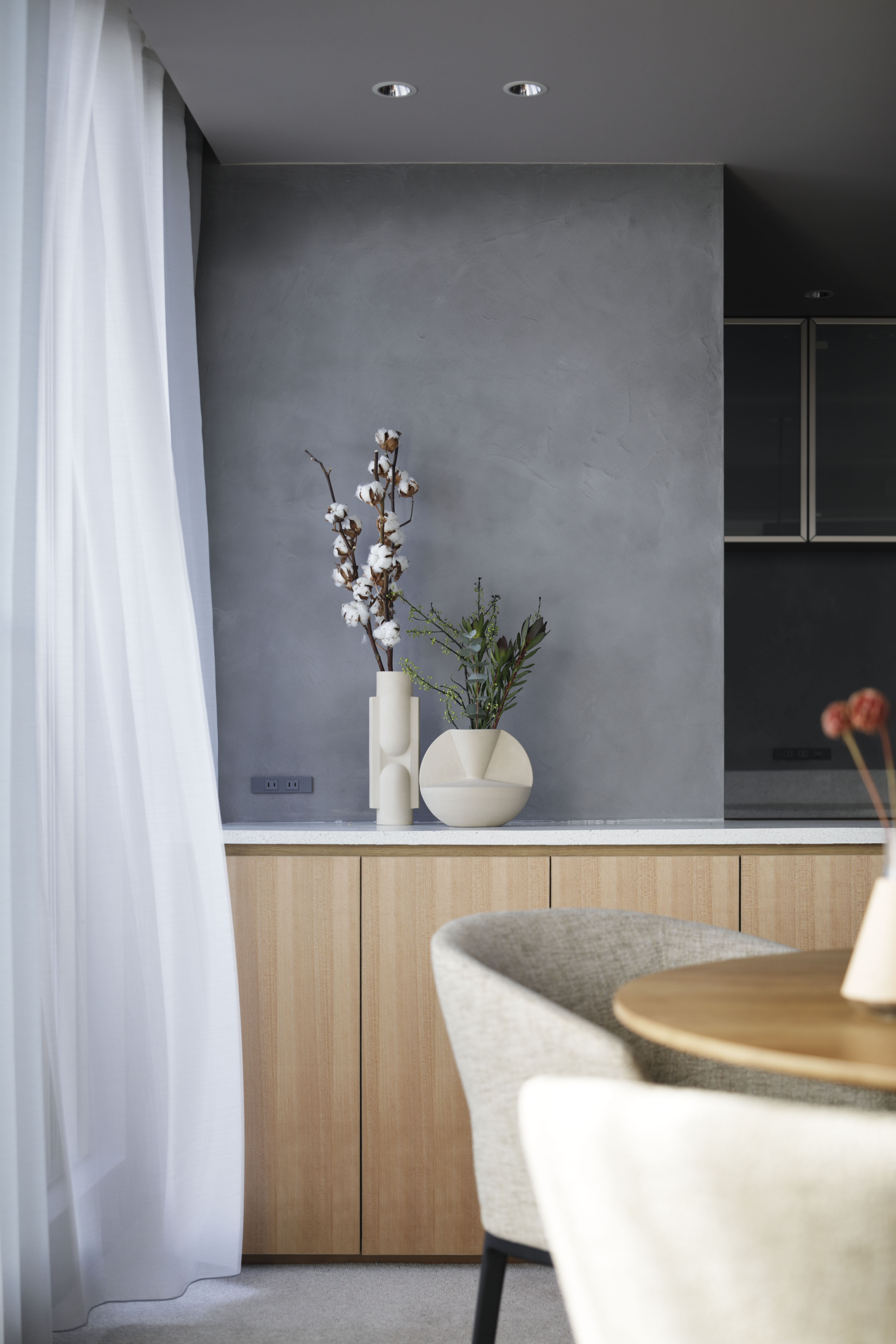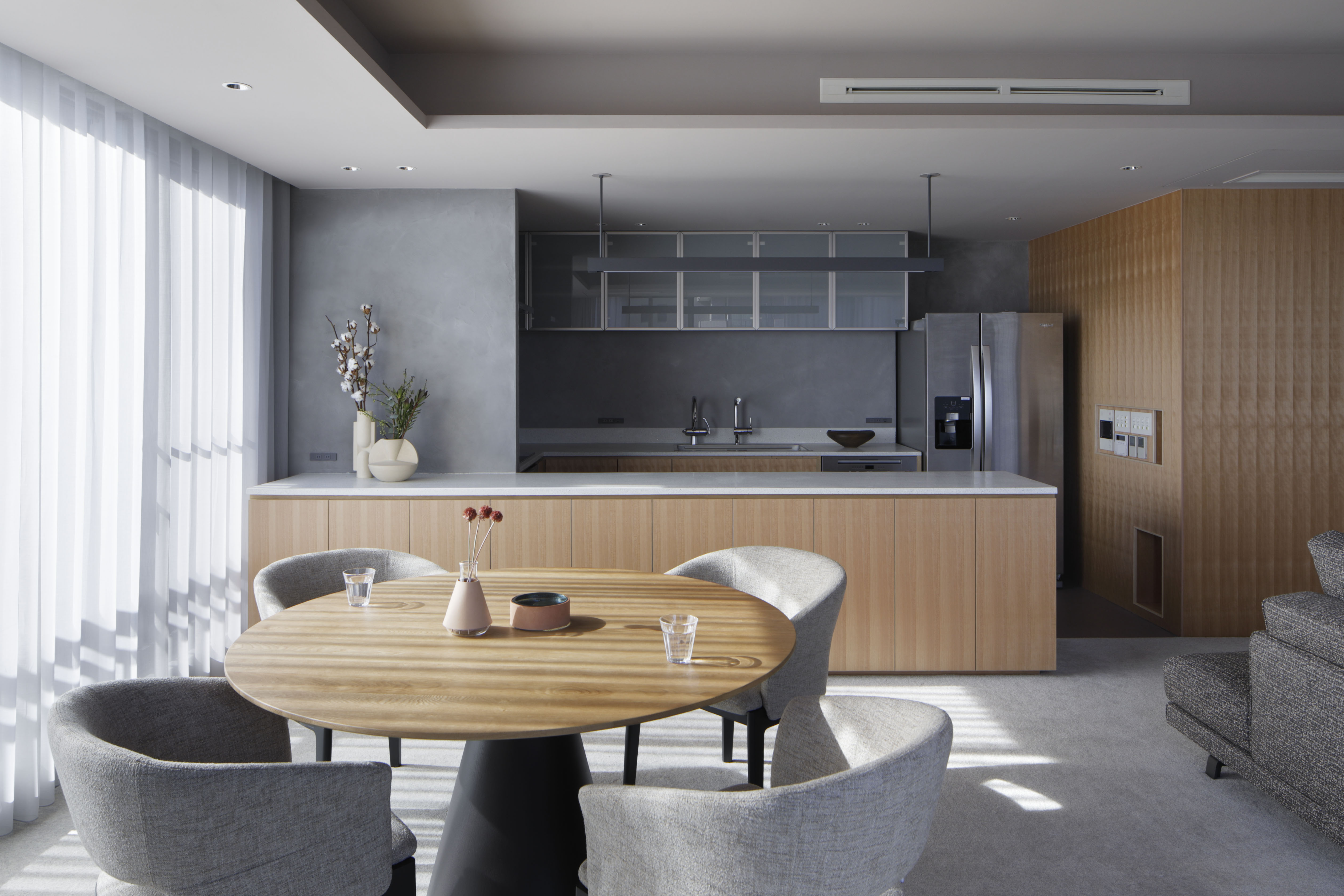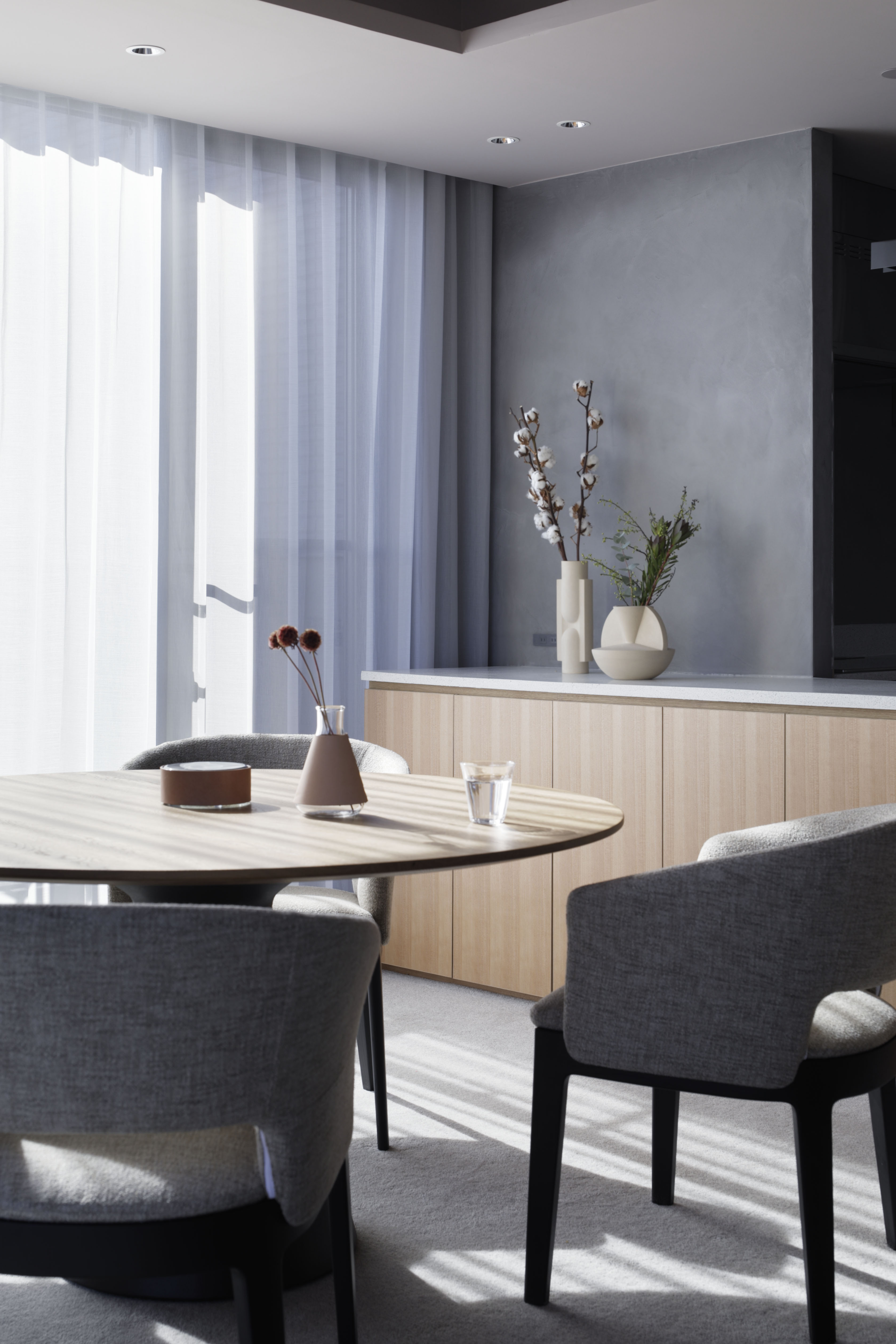 余計な要素はそぎ落とし、ホワイトグレーと木のモノトーンが、差し込む光を心地よく受け止め、落ち着きに満ちた時間を感じさせる。