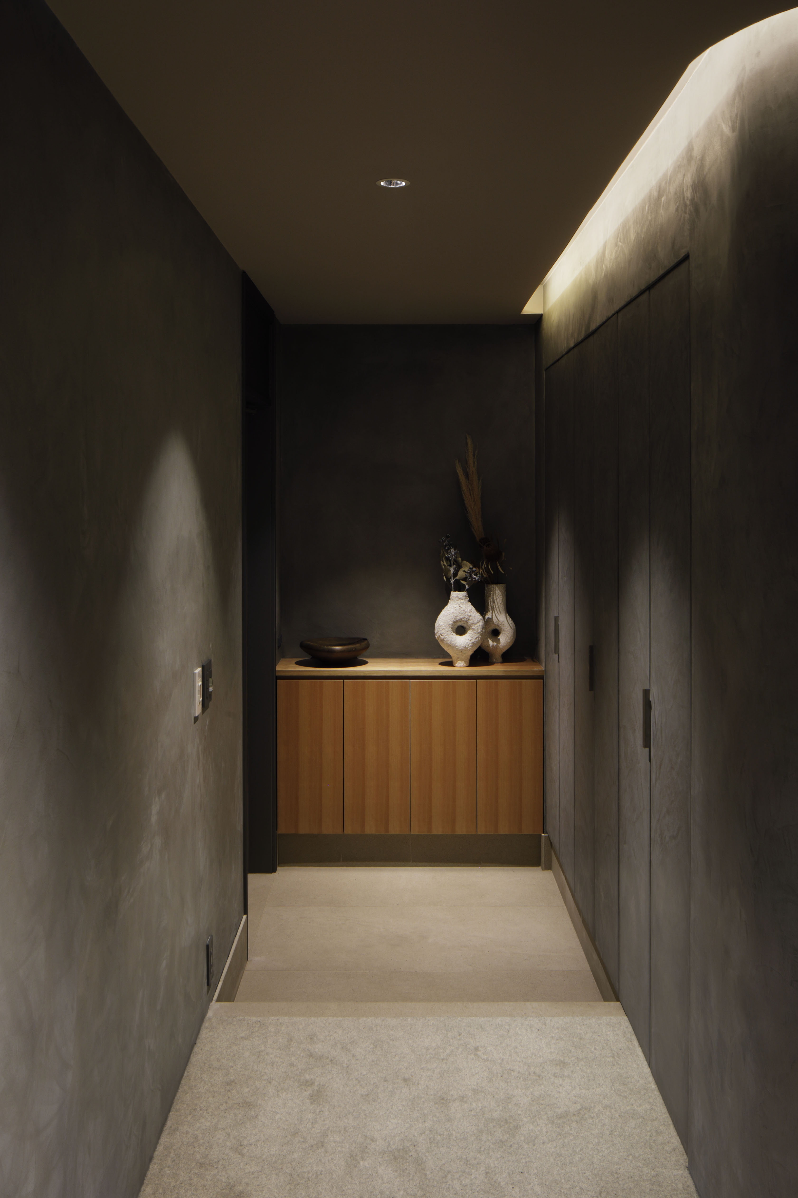 玄関には、サクラ材の造作収納を設えた。グレーで統一した壁面と天井を走る間接照明は、弧を描きながら奥に広がるリビング空間とへシームレスに導く。