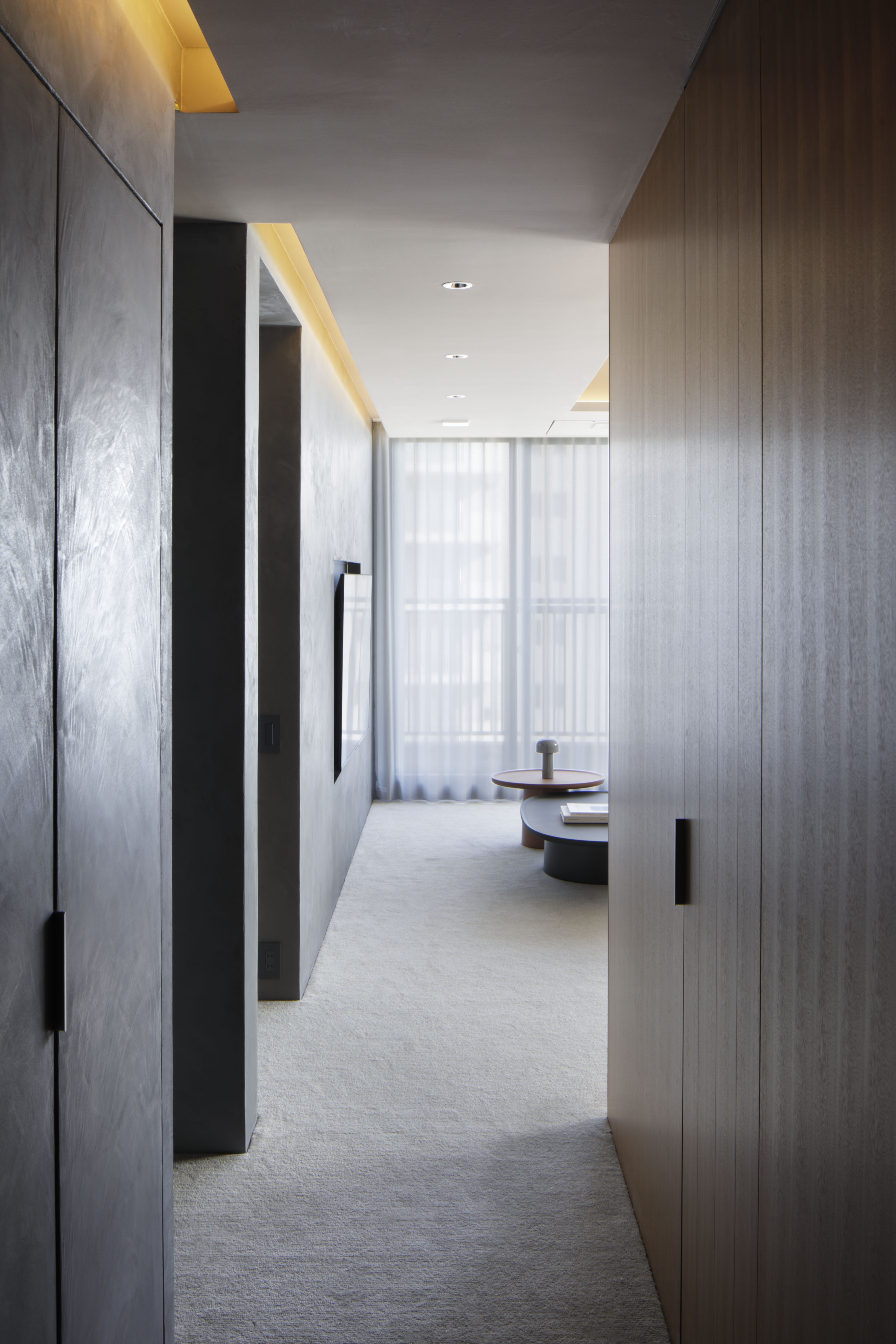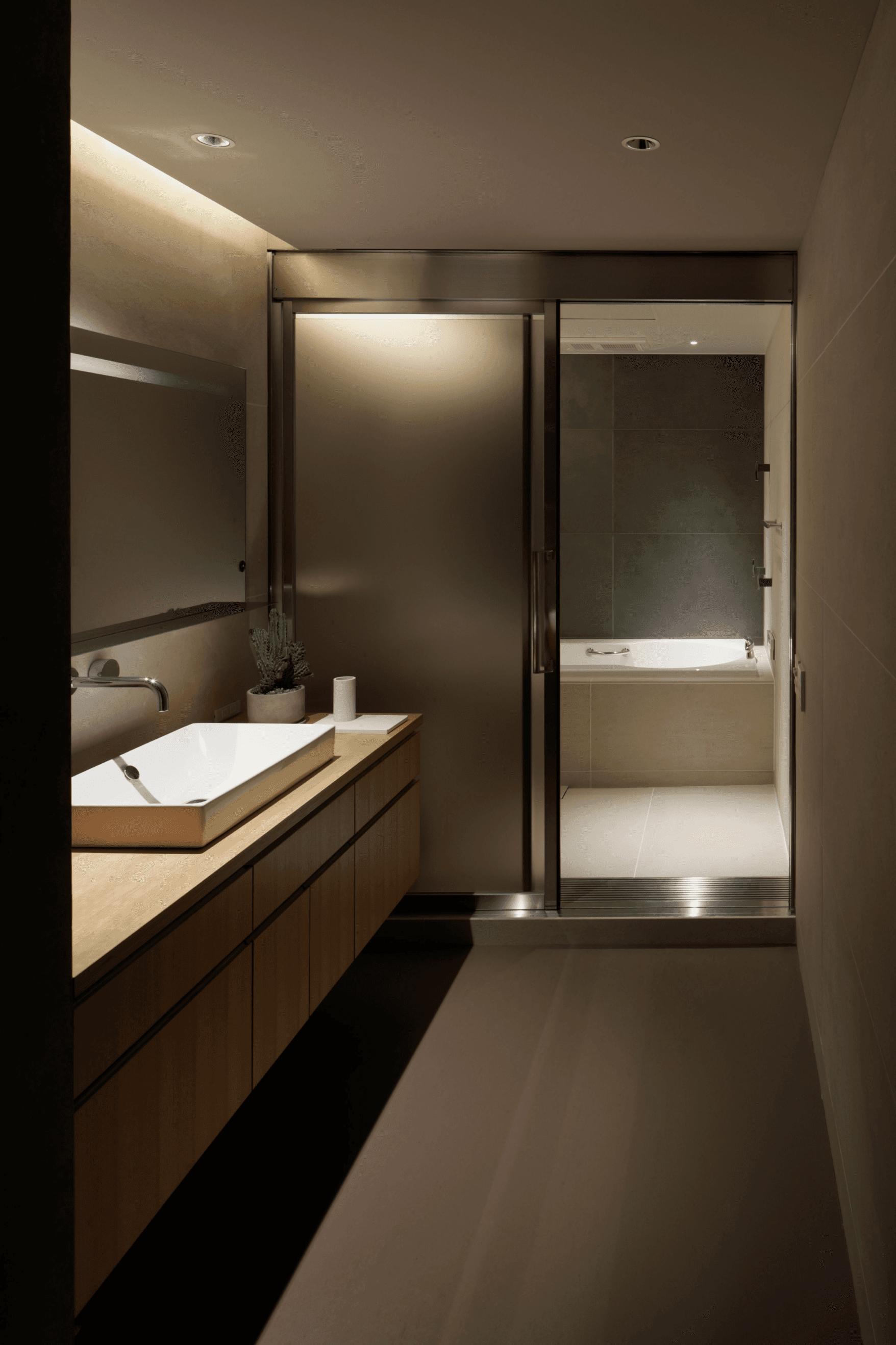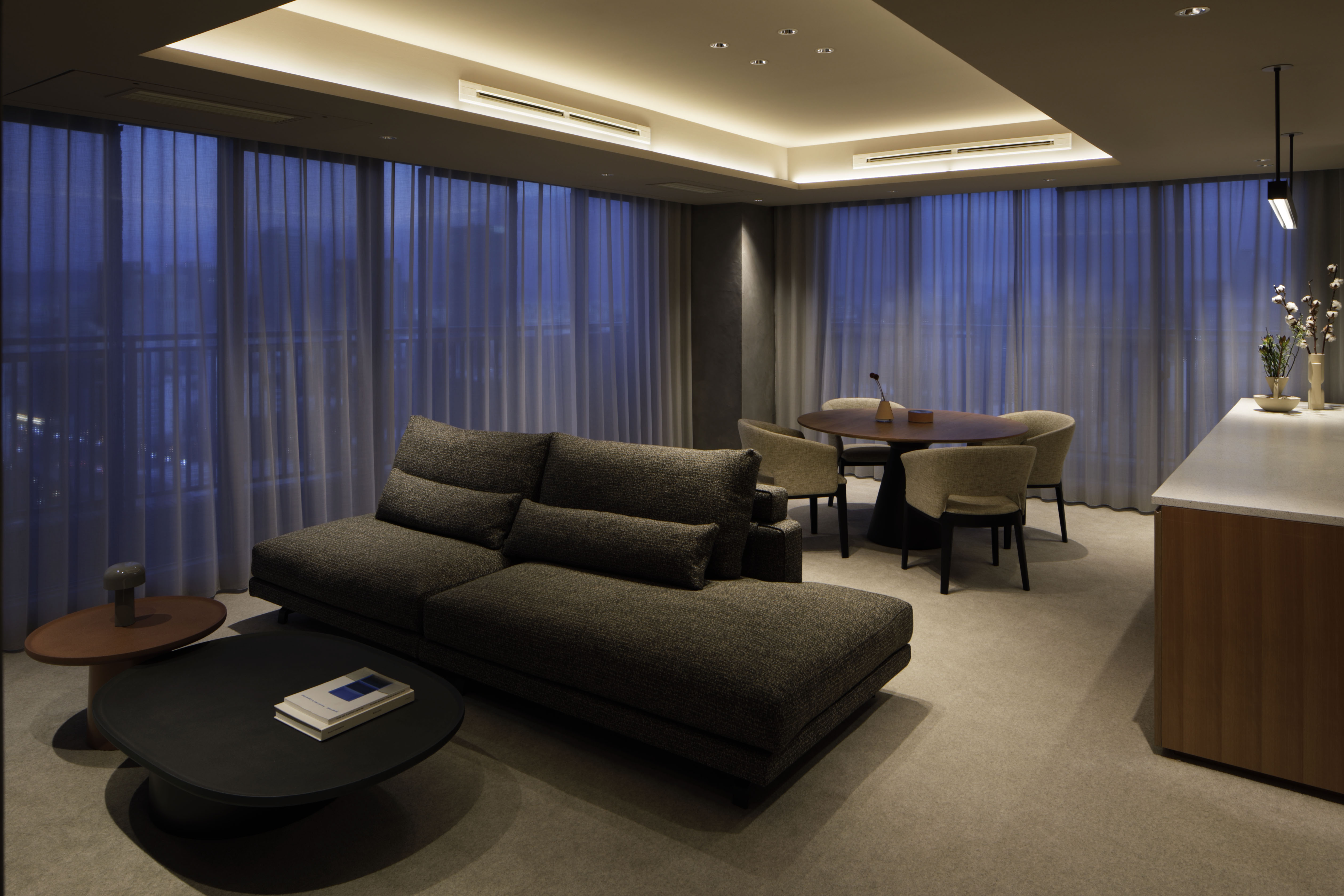 昼間の自然光がもたらす柔らかな印象とは対照的に、照明による演出が落ち着いたトーンを生み出し、大人のためのホテルライクな心地よい空間をつくり出している。