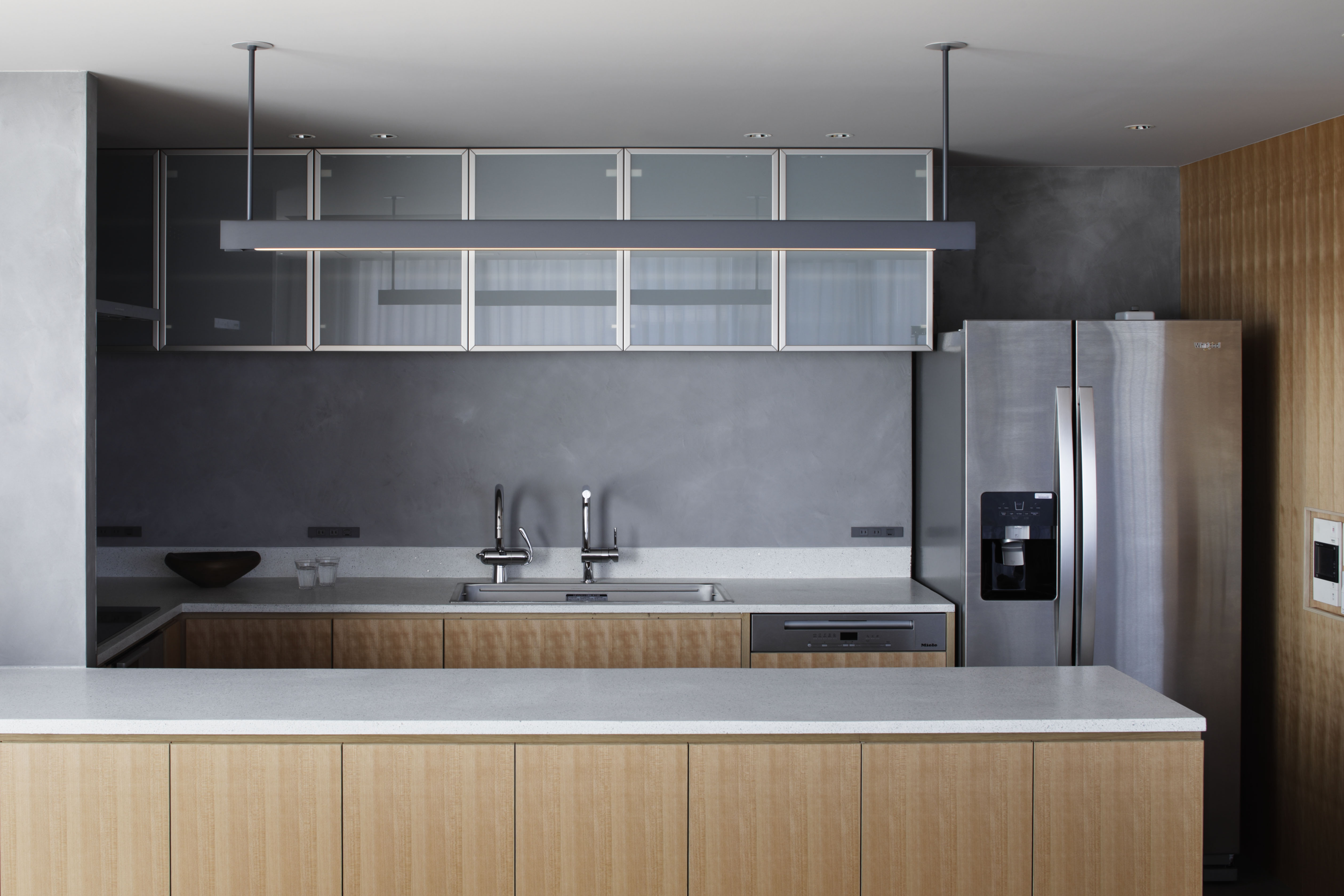 グレーのモールテックスに、サクラ材の造作カウンターとカーペットを組み合わせることで、質感のコントラストを演出。これらが手触りの豊かさだけでなく空間に柔らかさと安心感を感じさせる。