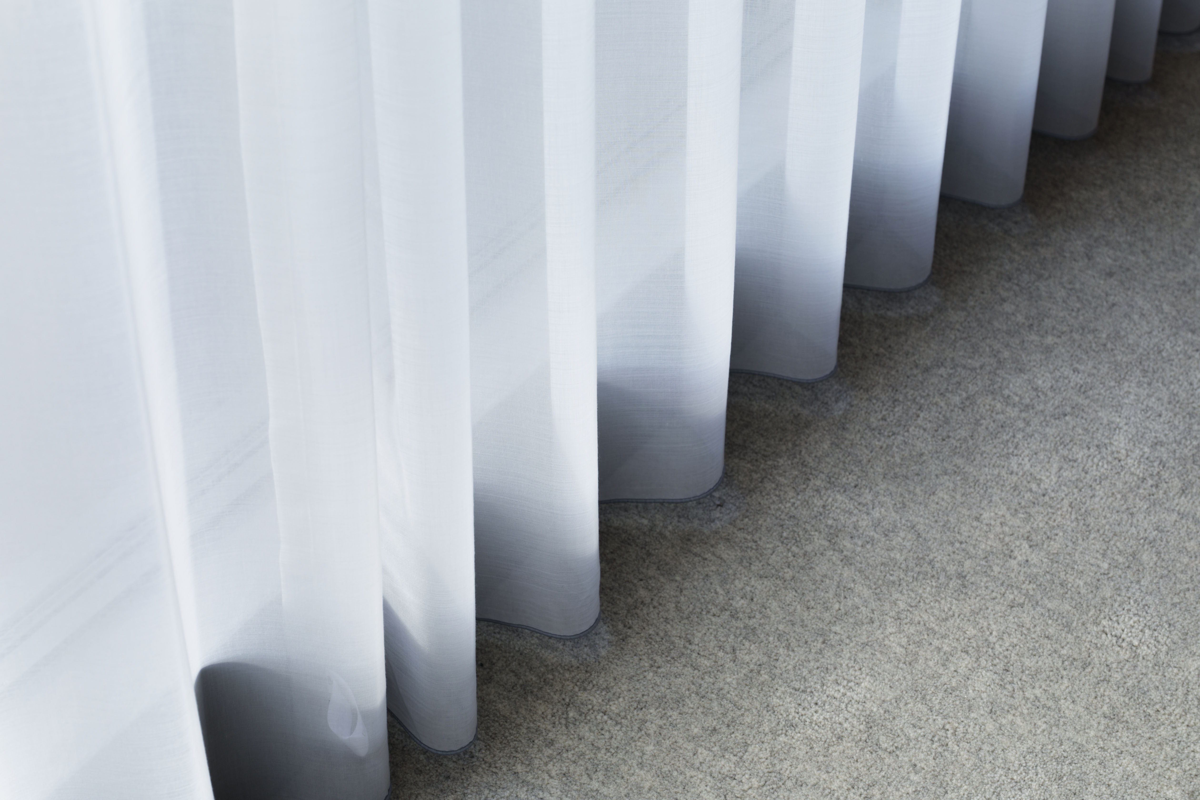 Kvadratのカーテンが自然光を柔らかく受け止め、カーペットの質感と調和しながら、静寂さを感じさせる。