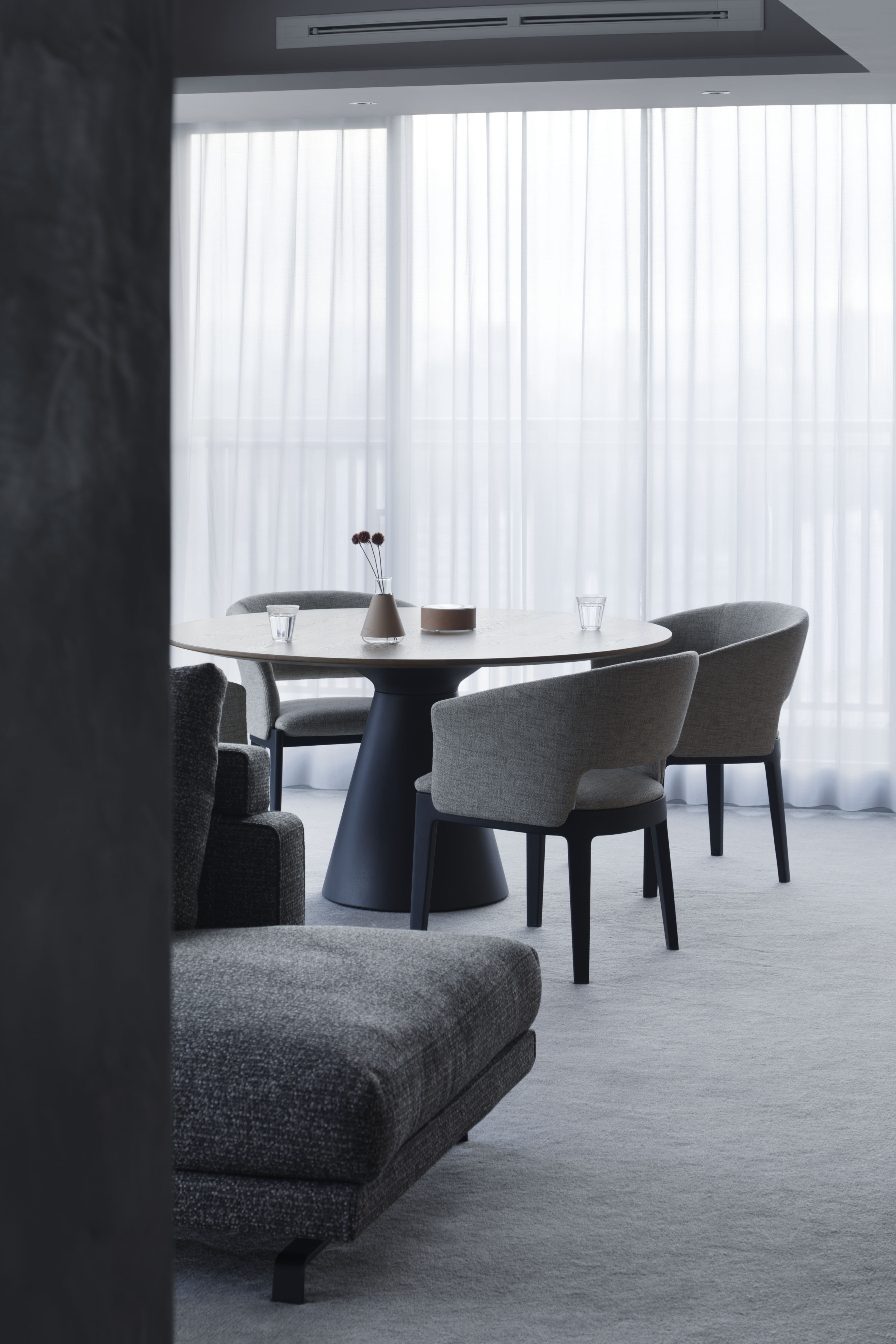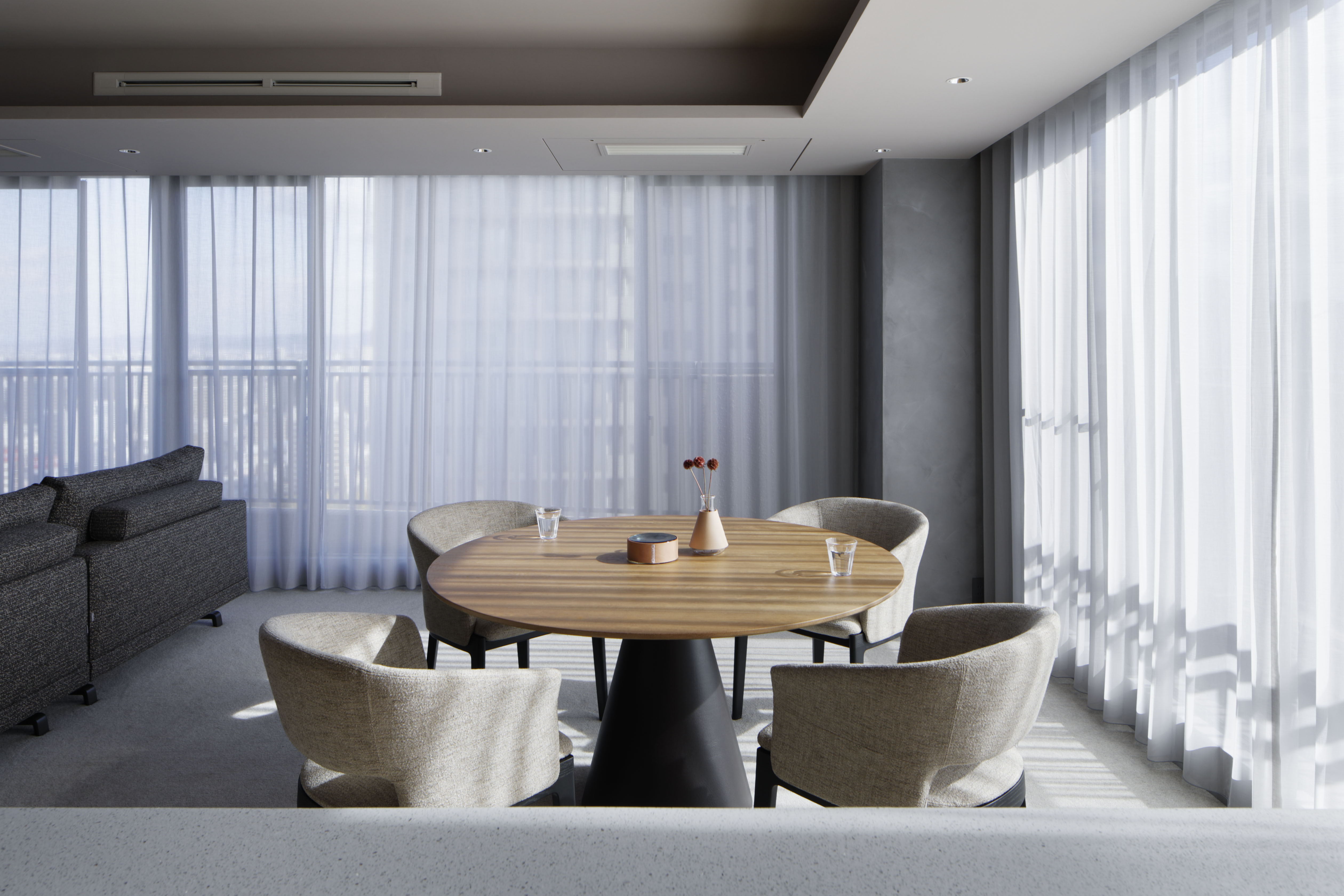 レース越しに差し込む柔らかな光が、厚みのあるカーペットやソファ、椅子のフォルムを引き立て、色や素材の質感までも優しく映し出す。設計段階から家具も一緒に計画することで、空間全体に一貫した統一感を出せるのではないか。